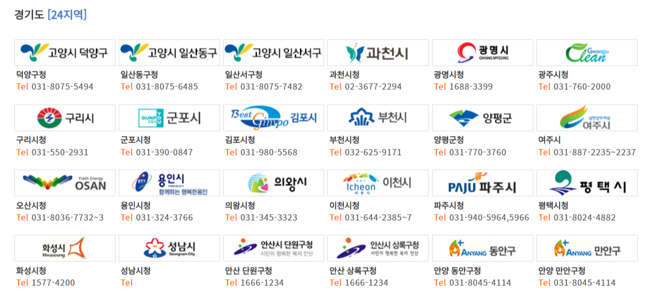 ▶경기도 지역은 24개의 지역입니다. 고양시 덕양구, 고양시 일산동구, 고양시 일산서구, 고천시,광명시,광주시, 구리시, 군포시, 김포시, 부천시, 양평군, 여주시, 오산시, 용인시, 의왕시, 이천시, 파주시, 평택시, 화성시, 성남시, 안산시 단원구청, 안산 상륙구, 안양 동안구, 안양 만안구가 해당지역입니다.